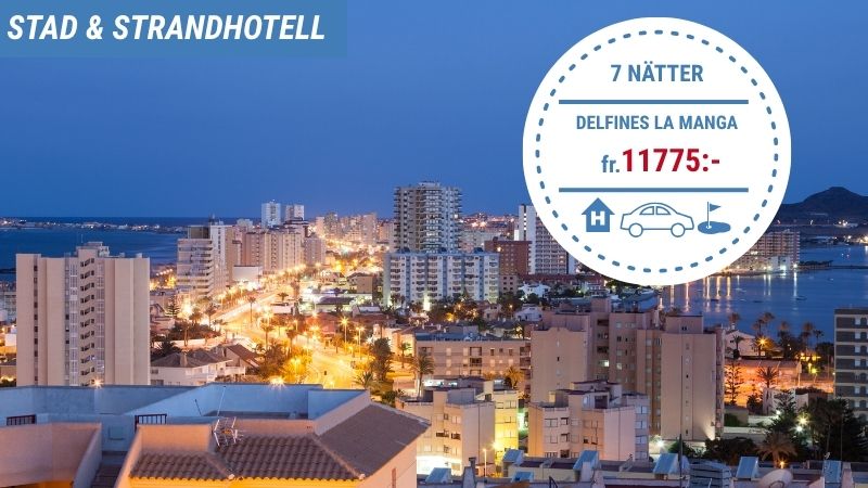 Upptäck Hotel Los Delfines – en trivsam och solrik utgångspunkt vid La Manga, där Medelhavets och Mar Menors glittrande vatten möts. Här bor du på ett bekvämt och välskött hotell med gångavstånd till strand, restauranger och den charmiga miljön runt La Manga-stripen. Hotellet erbjuder ljusa rum med balkong, generösa frukost- och middagsbufféer samt fina möjligheter till avkoppling mellan rundorna. Med upp till fem varierande golfbanor på programmet – La Manga Golf Clubs tre banor, La Serena och Mar Menor – får du en resa fylld av både spelglädje och omväxling. Det här är en golfresa som blandar havsbris, välslipade fairways och den varma, spanska småstadskänslan på ett sätt som gör att du snabbt känner dig hemma.