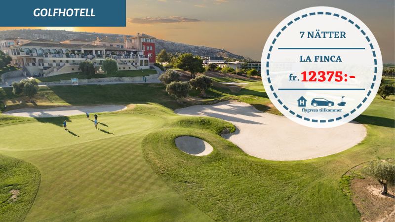 Ni spelar golf på hemmabanan La Finca som måste rankas som en av de bästa på Costa Blanca. Denn parkbana passar alla sorters golfare och erbjuder breda fairways men också möjligheten att utmana för den modige spelaren. Utöver tre rundor på hemmabanan ingår utflyktsrundor på klassiska banan Villamartin som är den äldsta banan på kusten och alltid en upplevelse att spela.