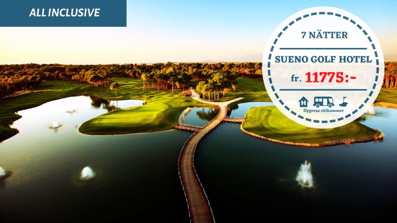 En golfresa till Sueno Golf är en bekväm upplevelse där ni får mycket för pengarna. Hotellet är ett av kusten mest attraktiva golfhotell av fler olika anledningar. Det unika är att ni från frukostrestaurangen eller lobbybaren kan promenera direkt ut till två högklassiga golfbanor, Sueno Dunes och Sueno Pines. Efter rundan kan ni njuta av förfriskningar på golfterrassen med vy över artonde på de båda banorna och koppla av i den värmande Medelhavssolen. Utöver en diger all inclusive på hotellet har ni dessutom tillgång till det nyare grannhotellet Sueno Delux hela utbud av mat, dryck, strand och fantastiska faciliteter. Promenaden till Deluxe är på ca 500 meter.